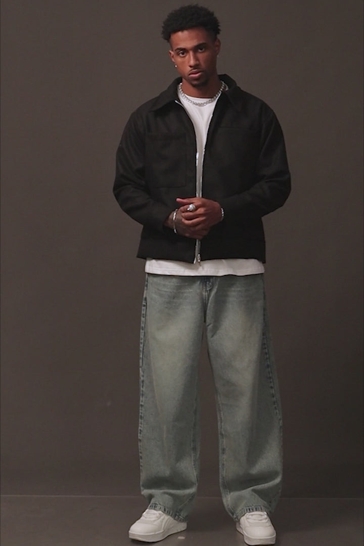 - Steven mide 1.86 y está usando un pantalón talla 32 y una jacket M